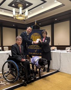 寒い中を兵庫介助犬協会理事長北澤光大様と、木村佳友様が介助犬エクラ号を連れて例会にお越し下さいました。クラブ継続寄付金を協会北澤様に、そして例会毎に募金して集めました介助犬ご飯代を木村様にお渡しし、エクラ号は体中で楽しそうにデモンストレーションして見せてくれました。喜んでお勤めを果たす介助犬の素晴らしさを再認識できる良い機会となりました。